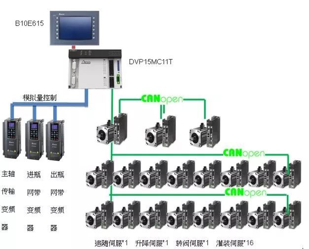 在這一方案中,灌扎線的系統(tǒng)控制全部由臺(tái)達(dá)多軸運(yùn)動(dòng)控制器DVP-15MC系列統(tǒng)一調(diào)配。搭配伺服驅(qū)動(dòng)系統(tǒng)ASDA-A2系列,進(jìn)行追隨、升降、轉(zhuǎn)閥、灌裝等。而進(jìn)瓶網(wǎng)帶、出瓶網(wǎng)帶和傳輸線則由臺(tái)達(dá)變頻器負(fù)責(zé)。