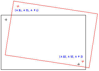 由于材料本體尺寸比較大,如果將被測物完全拍攝到,則其檢測精度必然無法達到要求。所以考慮只拍攝該板材上的上下兩個MARK(標(biāo)記)的位置,獲知兩個MARK點的偏移量后可通過推導(dǎo)得出該板材的整體偏移量以及旋轉(zhuǎn)角度。