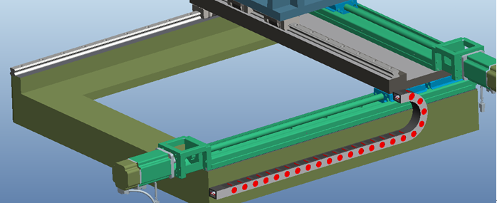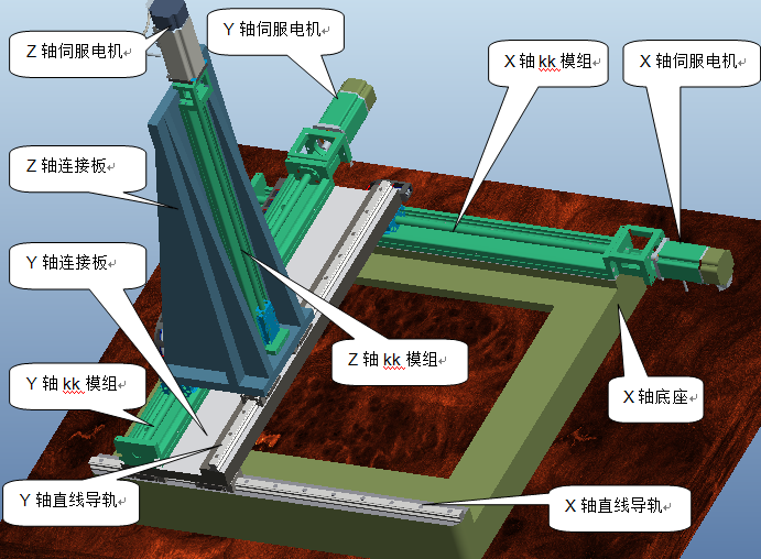 為了提高Z軸的抗變形及抗沖擊能力,Y軸結(jié)構(gòu)上采用KK模組和直線導軌的雙軸設計,其能確保Z軸結(jié)構(gòu)件的穩(wěn)定,提高產(chǎn)品整體設計的剛度,確保使用過程中結(jié)構(gòu)穩(wěn)定可靠。具體結(jié)構(gòu)如下:
