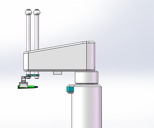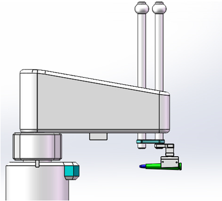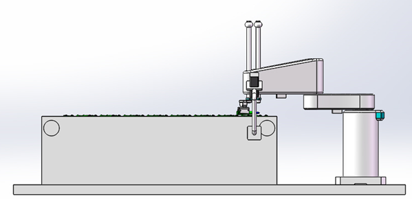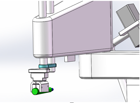 Scara平面關(guān)節(jié)機器人負責搬運和動作的實施,落實槍械子彈的姿態(tài)糾正和從來料輸送鏈抓取子彈并將糾正姿態(tài)后的子彈運送和碼垛到彈夾上。