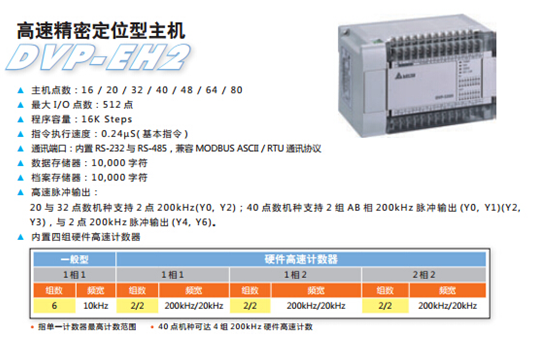 PLC采用臺達高速精密定位型EH系列主機,性能穩(wěn)定,功能強大,運算速度快,程序和數(shù)據(jù)存儲量大,支持多種通訊方式。
