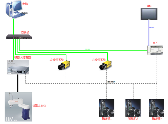 如上圖所示,機器人控制器,2臺視覺系統(tǒng),PLC全部進交換機。如果,有需要交換機可以進PC,采集和控制機器人、視覺系統(tǒng)、PLC。同時,在本地PLC與HMI通訊。終上即可以實現(xiàn)本地控制,也可以實現(xiàn)遠程控制與監(jiān)控。