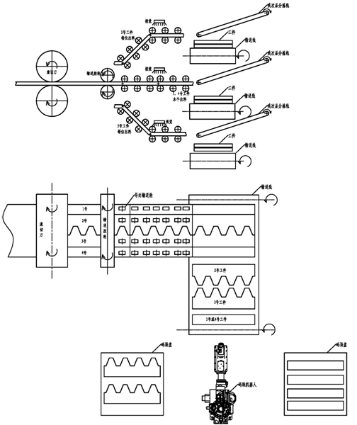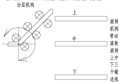 2) 分層導(dǎo)向系統(tǒng):實現(xiàn)不同工件或同一種工件的分層出料,同時解決工件在滾切工藝后的橫向粘連(長度1000mm方向)。出料方式有上中下三種,根據(jù)出料工藝的不同選擇其兩種或三種;然后每種工件進入各自的輸送線,在上中下三層輸送線上設(shè)置雙動力輸送滾輪,其中一組動力提供給線速度與滾切刀速度一直的動力,另外一種也與其保持一致,只是間斷性(每一個工件提速一次)提供高于滾切刀線速度的速度,用以解決滾切工藝縱向的粘連(寬度333mm方向),于此將工件輸送到各層對應(yīng)的立體輸送線上。