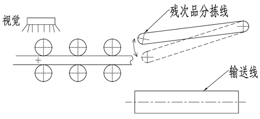 此系統(tǒng)實現(xiàn)瀝青瓦滾切工藝后的分揀及碼垛工序。主要包含自動分揀系統(tǒng)、殘次品分揀系統(tǒng)及碼垛系統(tǒng)三大部分。