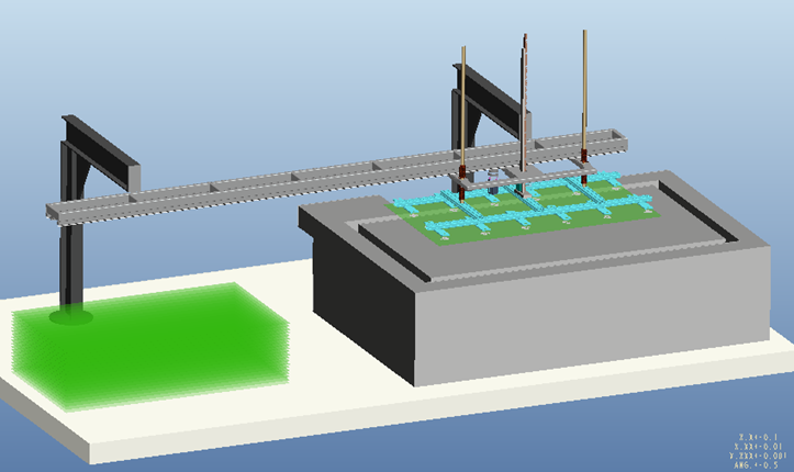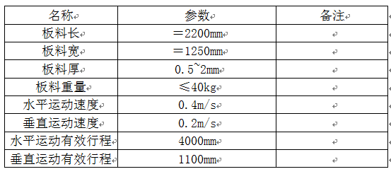 甲方目前使用人工搬運(yùn)方式,將所需切割板料搬運(yùn)到激光數(shù)控切割機(jī)。此搬運(yùn)方式需要至少兩個(gè)人配合,且勞動(dòng)強(qiáng)度大。為了解決目前情況,我公司專門設(shè)計(jì)自動(dòng)物料搬運(yùn)設(shè)備,此設(shè)備只需一人操作,通過按鈕手動(dòng)控制抓取物料后即可自動(dòng)上料并返回取料位置。