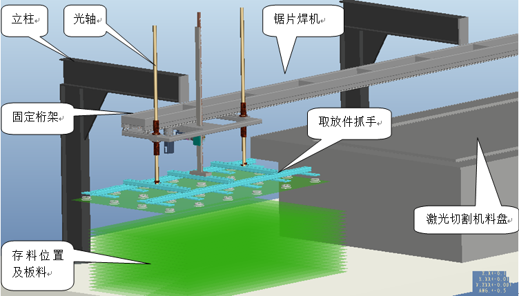 此系統(tǒng)為實(shí)現(xiàn)激光切割機(jī)焊機(jī)的半自動(dòng)上下料而特別設(shè)計(jì)的。本系統(tǒng)由垂直提升系統(tǒng)和水平運(yùn)動(dòng)系統(tǒng)及取放件系統(tǒng)等構(gòu)成;配套自動(dòng)化控制系統(tǒng)和智能界面,實(shí)現(xiàn)人工手動(dòng)控制取件,完成板料自動(dòng)搬運(yùn)、自動(dòng)放料、自動(dòng)歸位的自動(dòng)化上下料過程。