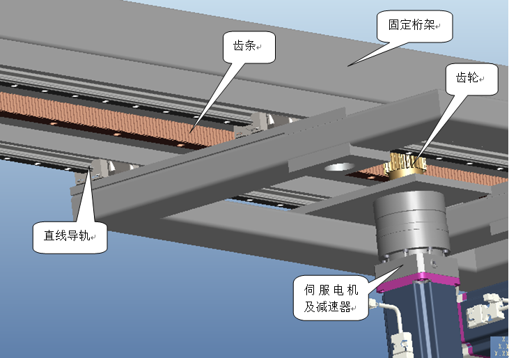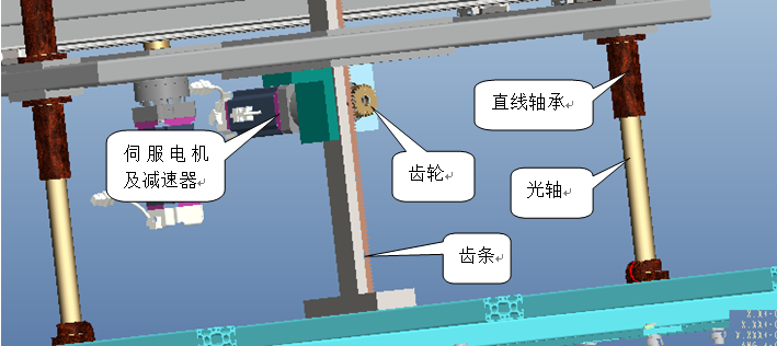 傳動(dòng)系統(tǒng)采用齒輪齒條傳動(dòng),并配置臺(tái)達(dá)伺服電機(jī)及新寶減速器。齒輪齒條運(yùn)動(dòng)平穩(wěn)可靠,并且性價(jià)比極高,此設(shè)計(jì)可以有效減輕甲方的采購成品。