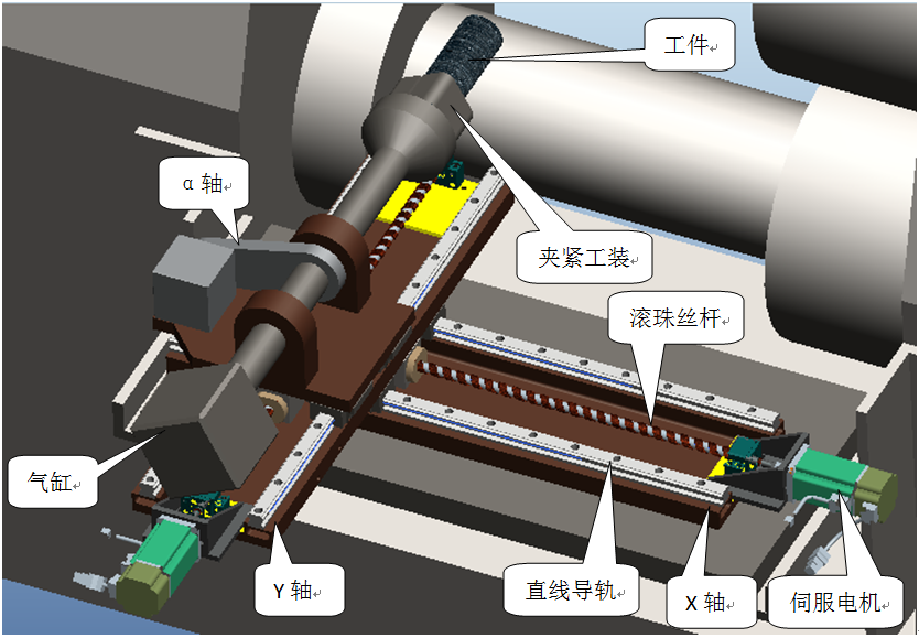 1. 輥軋機械手方案由X軸、Y軸、α軸、夾緊工裝、電控系統(tǒng)及氣路系統(tǒng)。XY 軸由伺服電機、直線導(dǎo)軌、滾珠絲桿和機座構(gòu)成;α軸由伺服電機、同步帶、同步帶輪等構(gòu)成;夾緊工裝由氣缸和夾緊機構(gòu)等構(gòu)成;