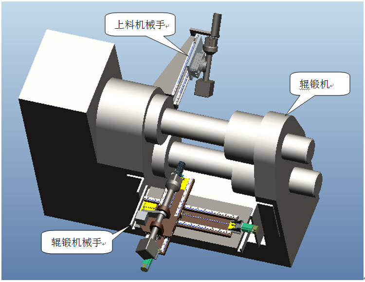 方案根據(jù)輥鍛特點設(shè)計的兩坐標(biāo)、三軸機械手,可以適應(yīng)不同品種的輥鍛要求;同時根據(jù)現(xiàn)場條件,定制安裝方式,減少現(xiàn)場安裝時間。機械手采用進(jìn)口直線導(dǎo)軌、滾珠絲桿、伺服電機,確保機械手的品質(zhì)和使用壽命,設(shè)計上采用高安全系數(shù),保證機械手的可靠性。同時為了避免人工上料的不便,增加專用上料機械手,銜接中頻加熱爐和輥鍛機械手,實現(xiàn)二者無人化卸料和上料。