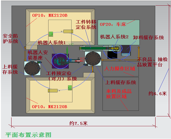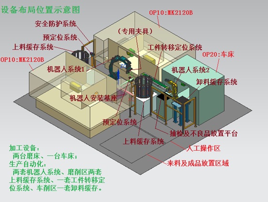 該自動(dòng)生產(chǎn)線由OP10磨床2臺(tái)、OP20車床1臺(tái)、機(jī)器人系統(tǒng)2套(含夾具及基座)、磨床上料緩存系統(tǒng)2套(含預(yù)定位對(duì)刀系統(tǒng))、工件轉(zhuǎn)移定位系統(tǒng)1套(含抽檢及放置平臺(tái))、OP20卸料緩存裝置1套、安全防護(hù)系統(tǒng)和電器控制(本方案中未作示意)系統(tǒng)組成。