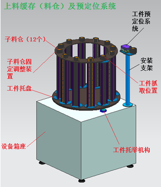 主要由具備分度轉(zhuǎn)位的工件托盤、工件托舉機(jī)構(gòu)、12個(gè)子料倉(cāng)和設(shè)備箱座及電器控制等部分構(gòu)成。