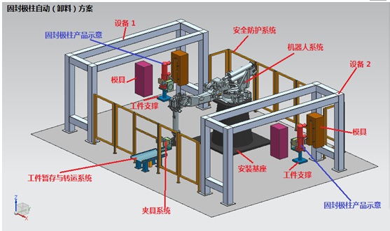 該方案屬于客戶生產(chǎn)線的技術(shù)改造方案,以提高作業(yè)效率、降低工人勞動強(qiáng)度、預(yù)防作業(yè)安全為基本目的。整個系統(tǒng)包括:機(jī)器人系統(tǒng)、夾具系統(tǒng)、安全防護(hù)系統(tǒng)、工件暫存與轉(zhuǎn)運系統(tǒng)、電器控制系統(tǒng)及安裝基座等構(gòu)成。