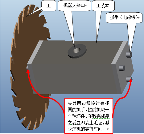取放件夾具的設(shè)計(jì)原則是滿足抓取功能的同時縮短鋸片焊機(jī)的等待時間,故在夾具兩邊都設(shè)計(jì)有相同的抓手,以便在取完成品后立即裝上毛坯件。