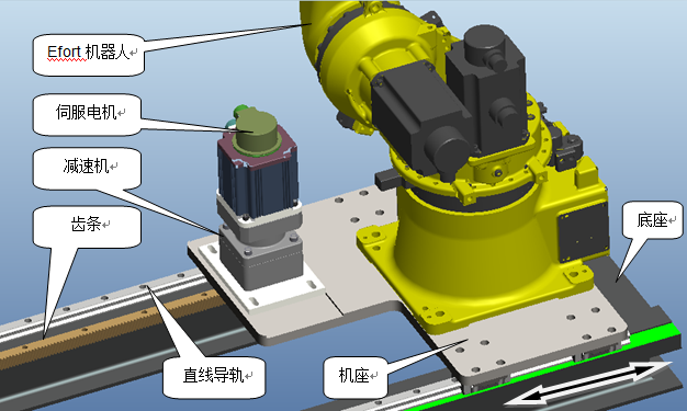 機(jī)器人七軸為機(jī)器行走機(jī)構(gòu),實(shí)現(xiàn)不同工位焊機(jī)之間的來回運(yùn)轉(zhuǎn)。此機(jī)構(gòu)采用伺服電機(jī)驅(qū)動,齒輪齒條傳動,直線導(dǎo)軌導(dǎo)向,底座采用型鋼焊接,分段制造、整體組裝。設(shè)計(jì)運(yùn)動速度42m/min。具體結(jié)構(gòu)見下圖。