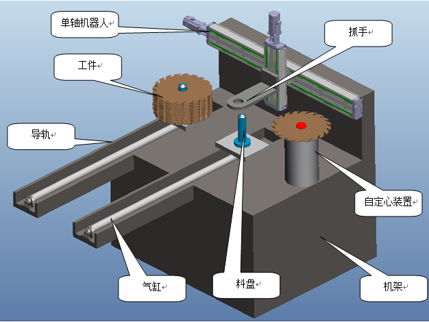 ? 自定心裝置的設(shè)計(jì)是為了給取放件機(jī)器人一準(zhǔn)確位置,方便在抓取之后準(zhǔn)確將工件裝載鋸片焊機(jī)上。