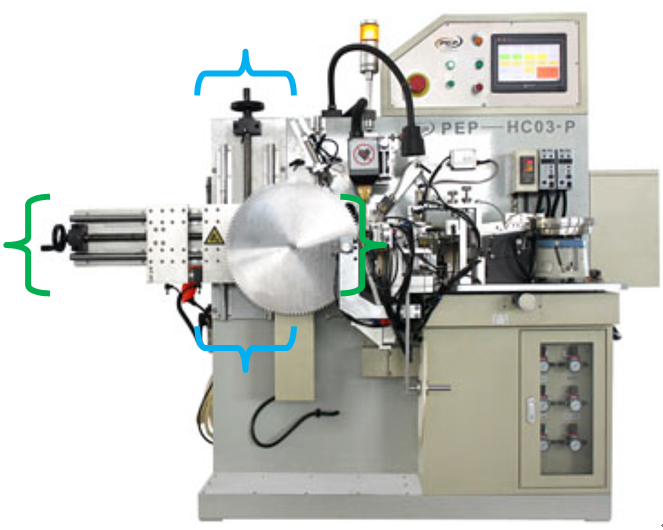 為了取放工件時機(jī)器人有足夠的空間活動,避免與鋸片焊機(jī)的干涉,需要對焊機(jī)上裝載工件的兩個活動軸進(jìn)行自動化改造(下圖括號標(biāo)記區(qū)域)。