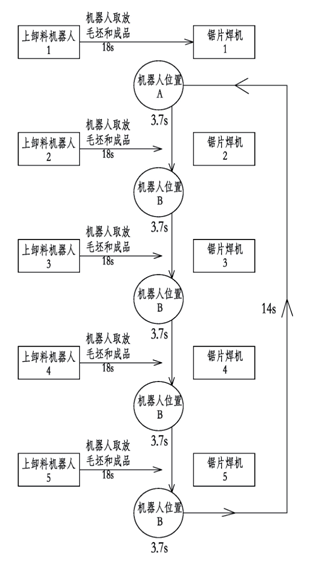 因?yàn)槊颗_焊機(jī)都有一個上卸料機(jī)器人,故只需要在焊機(jī)焊接時間2分鐘內(nèi)完成即可。具體節(jié)拍如下: